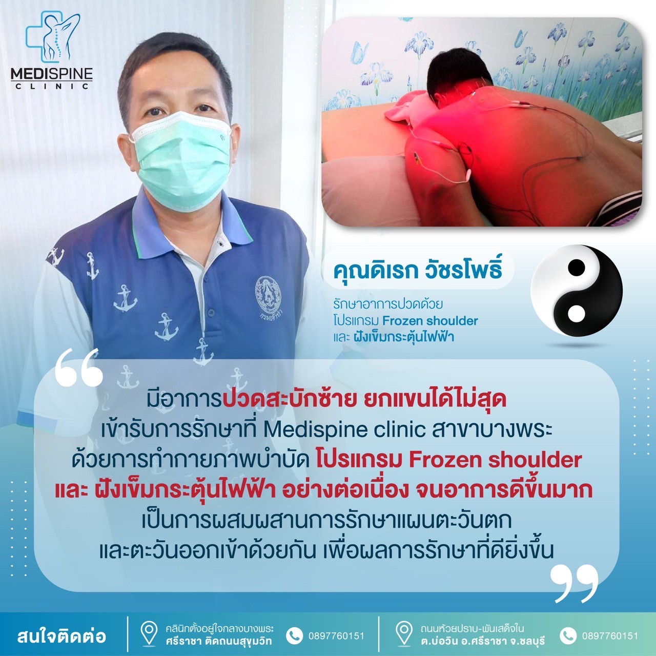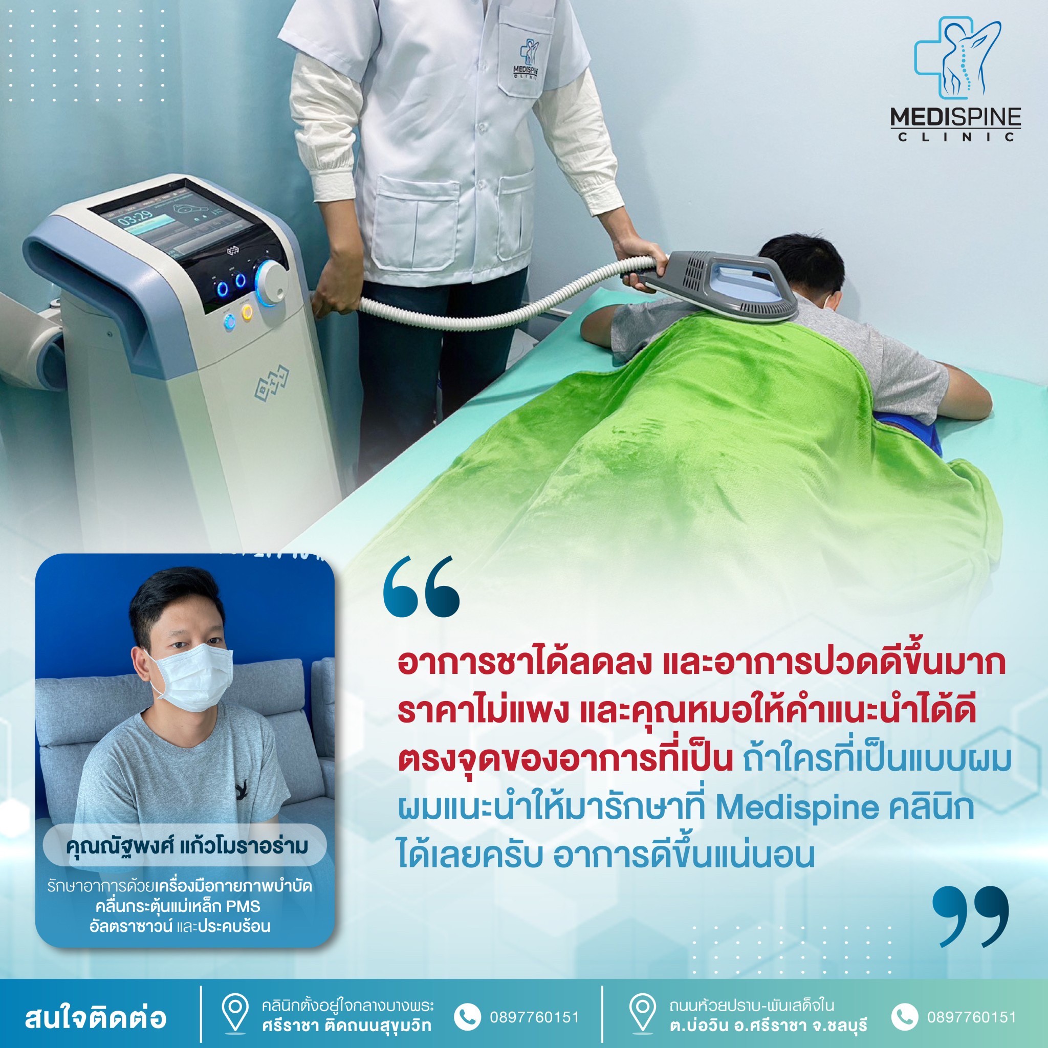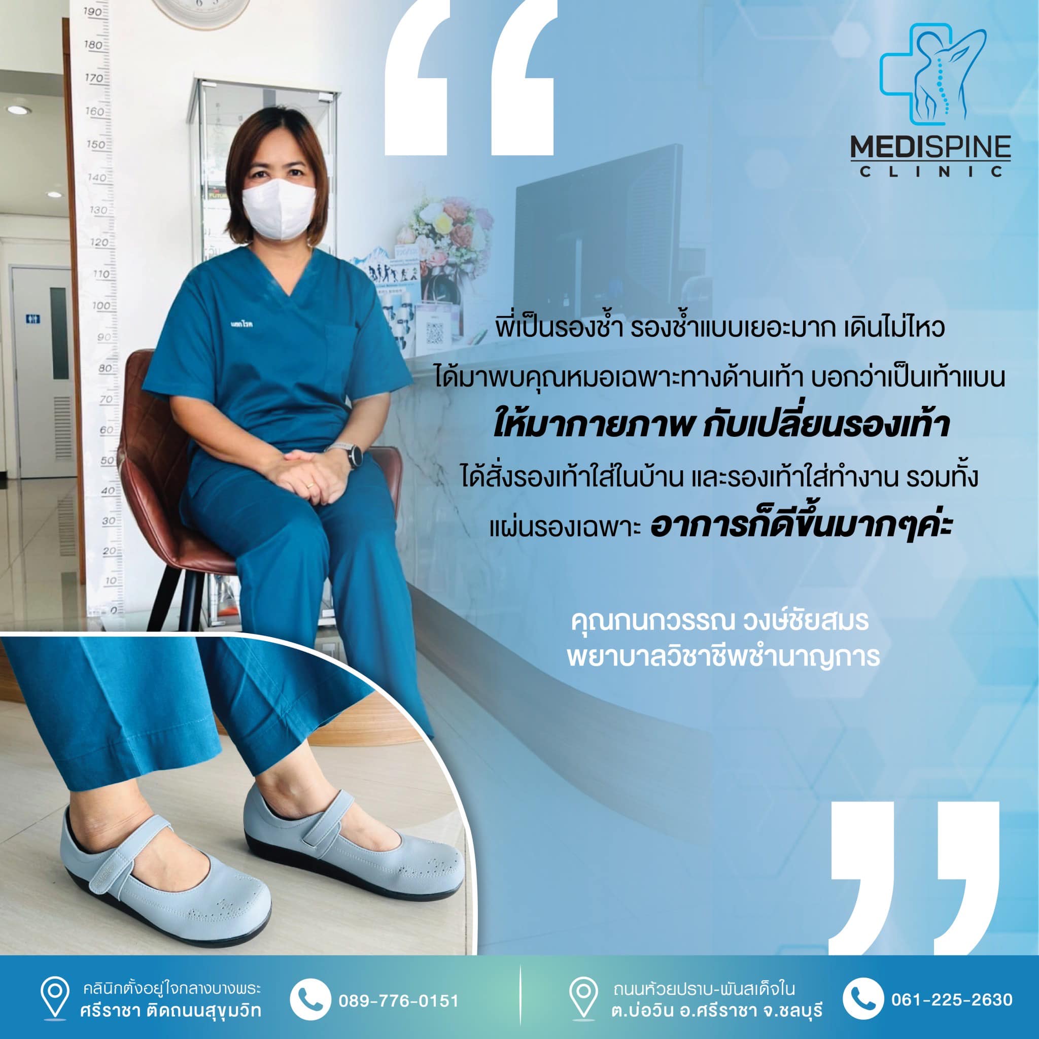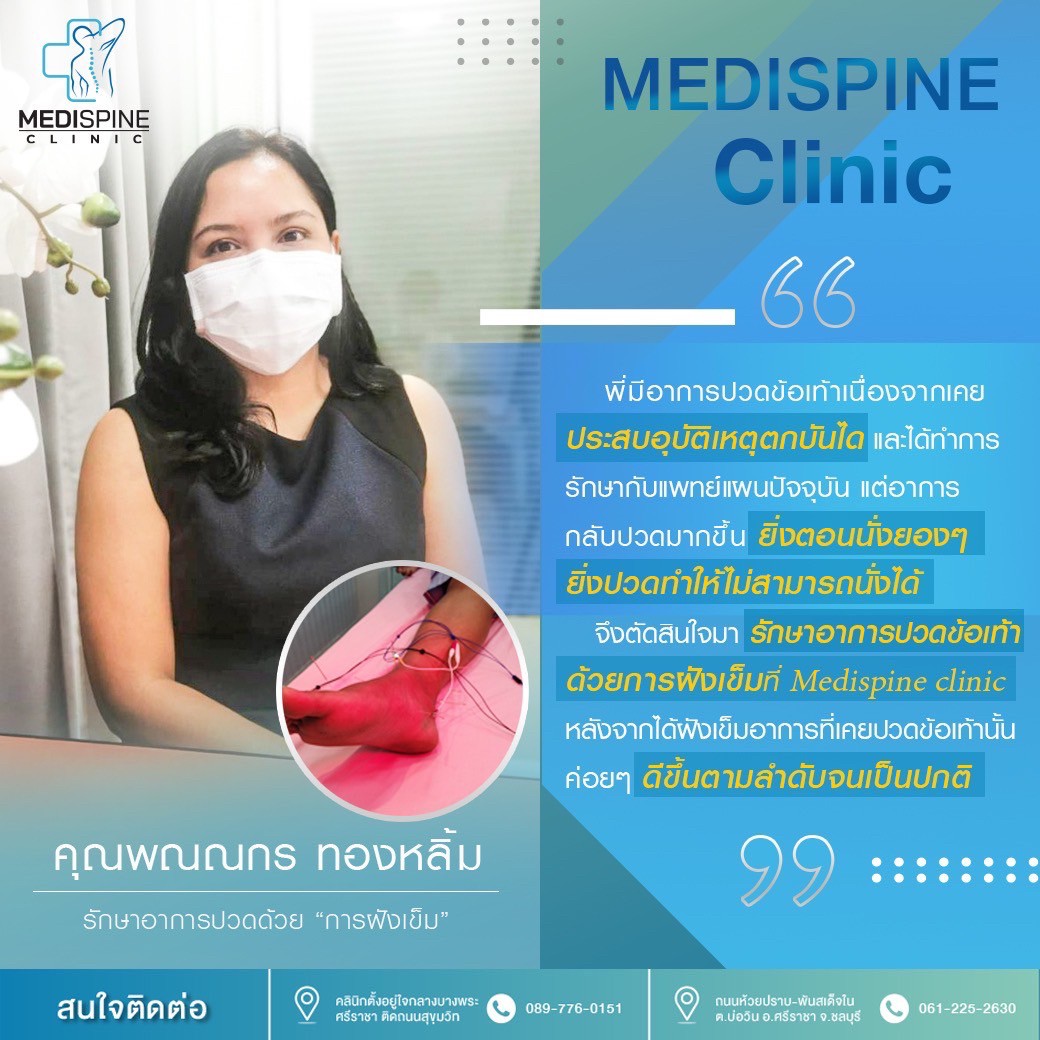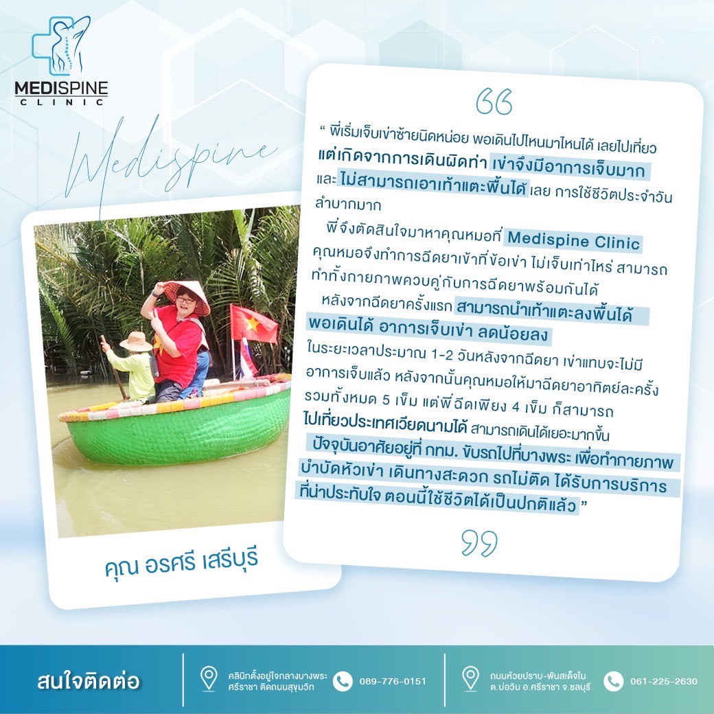 " พี่เริ่มเจ็บเข่าซ้ายนิดหน่อย พอเดินไปไหนมาไหนได้ เลยไปเที่ยว แต่เกิดจากการเดินผิดท่า เข่าจึงมีอาการเจ็บมาก และไม่สามารถเอาเท้าแตะพื้นได้เลย การใช้ชีวิตประจำวันเลยลำบากมาก พี่เลยตัดสินใจมาหาคุณหมอที่ Medispine Clinic คุณหมอจึงทำการฉีดยาเข้าข้อเข่า ตอนฉีดไม่เจ็บเท่าไหร่ สามารถทำทั้งทำกายภาพควบคู่กับการฉีดยาพร้อมกันได้ หลังจากฉีดยาครั้งแรก สามารถนำเท้าแตะลงพื้นได้ พอเดินได้ อาการเจ็บเข่าลดน้อยลง ในระยะเวลาประมาณ 1-2 วันหลังจากฉีดยา เข่าแทบจะไม่เจ็บแล้ว หลังจากนั้นคุณหมอให้มาฉีดยาอาทิตย์ละครั้ง รวมทั้งหมด 5 เข็ม แต่พี่ฉีดได้ 4 เข็ม ก็สามารถไปเที่ยวประเทศเวียดนามได้ เดินได้เยอะมากขึ้น ตอนนี้เดินไปได้ทุกที่ ปัจจุบันอาศัยอยู่ กทม. ขับรถไปที่บางพระ เพื่อทำการกายภาพบำบัดเข่า เดินทางสะดวก รถไม่ติด ได้รับการบริการที่น่าประทับใจ ตอนนี้ใช้ชีวิตเป็นปกติแล้ว "
